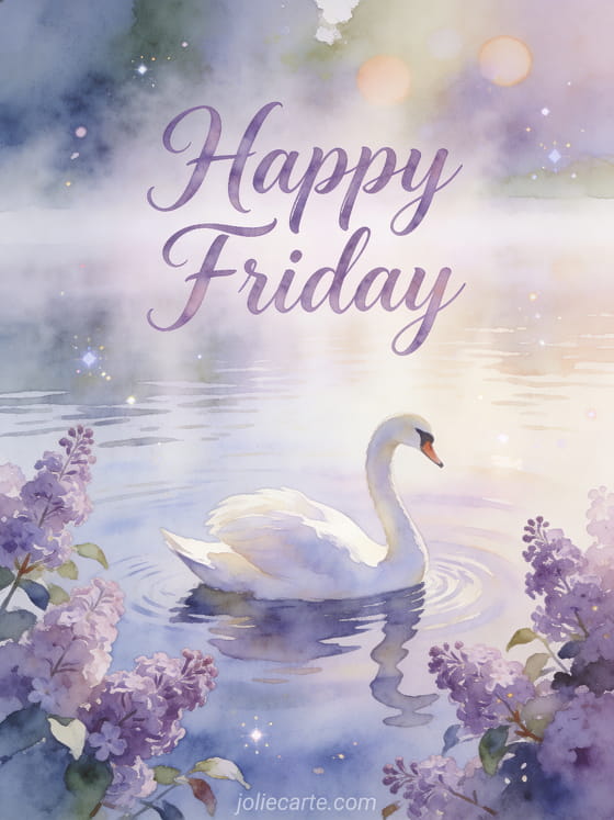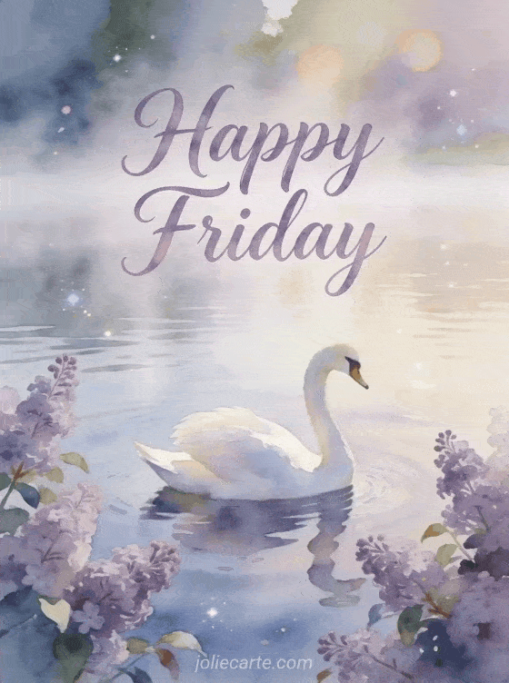 Start Friday morning beautifully with this elegant card featuring a graceful white swan gliding on a calm misty lake surrounded by lilac bushes. See also a happy friday gif or good morning have a great friday.