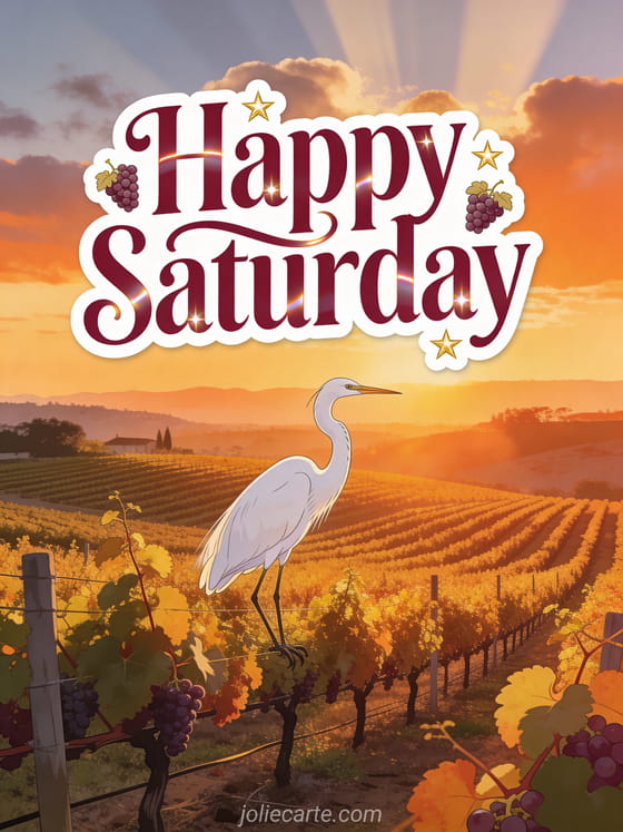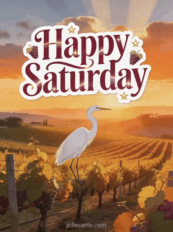 Send a warm happy Saturday with a Napa Valley vineyard, golden vine rows, grape stickers and a majestic white egret landing in orange sunset light. Discover also happy saturday friends gifs, friendship happy Saturday good weekend or good morning happy saturday kisses.