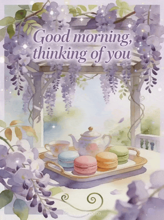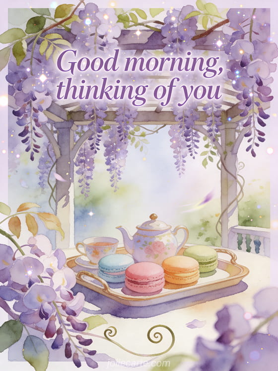 Send a friendly good morning card with soft lavender watercolor lettering, a wisteria-covered pergola, a cheerful tea tray and pastel macarons in airy spring light. Discover also a free virtual good morning cards, a pretty free virtual good morning card or a good morning and best wishes.