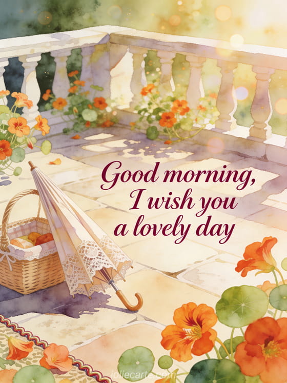 Send a good morning message for a woman with a refined watercolor scene on a sunny terrace, nasturtium flowers, a folded lace parasol and a small picnic basket. Share this graceful greeting to wish her a lovely day, and discover also marsh flowers, a good morning card or a friendly good morning message.
