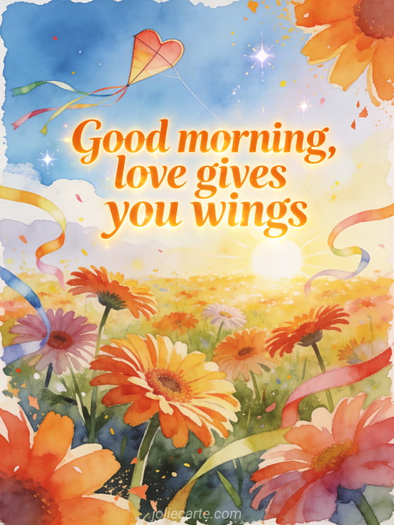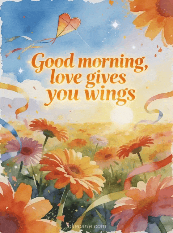 Send a good morning message for her man with a joyful card where love rises like a heart-shaped kite above colorful gerberas. You can also share a friendly good morning sms, a good morning animals card or a morning hello.