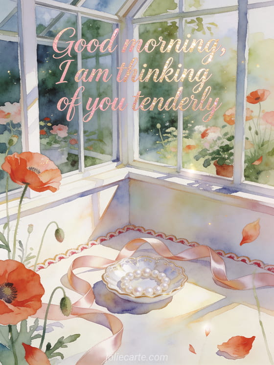 Send a poetic good morning message for her with delicate rose watercolor lettering, poppies, a pearl jewelry dish and satin ribbon loops in a bright conservatory corner. Discover also floral good morning card, free virtual good morning cards or good morning and best wishes.