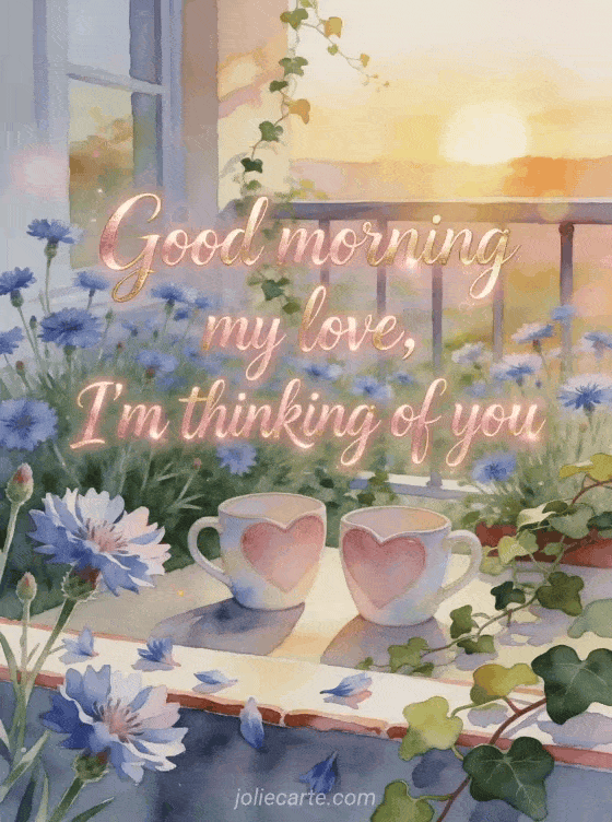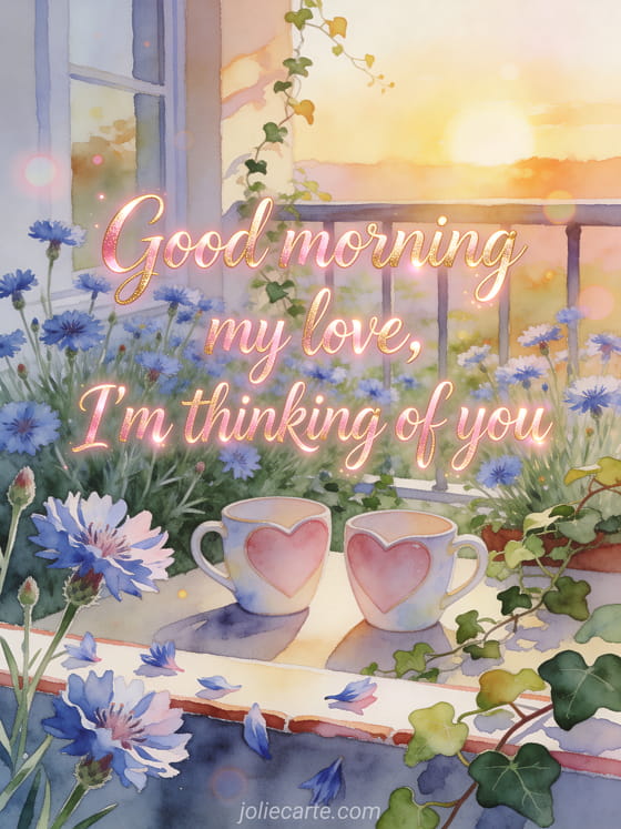 Send a tender good morning card with rose-gold watercolor lettering, a sunrise balcony garden, cornflowers, ivy and two heart-shaped ceramic mugs. Discover also a good morning virtual card, a good morning message to a friend or a good morning you virtual card.