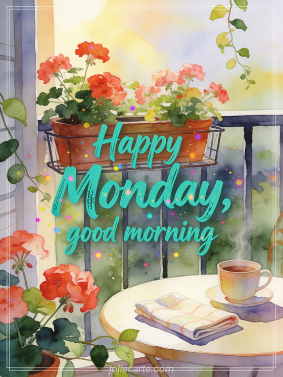 Start Monday with a friendly good morning message in bright teal brush script and luminous speckles. This free card shows a small balcony with geranium pots, a folded napkin and a steaming cup on a round table. Discover also an animated happy monday image card, a happy Monday encouragement image card or beautiful images for happy monday and good week.