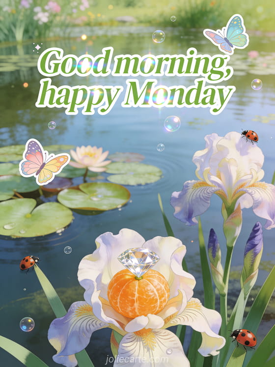 Send a gentle Monday morning greeting with a peaceful pond, water lilies, blooming water irises, colorful butterflies and a zebra finch perched on an iris. Discover also good week and happy Monday image, a happy Monday card or happy monday virtual cards.