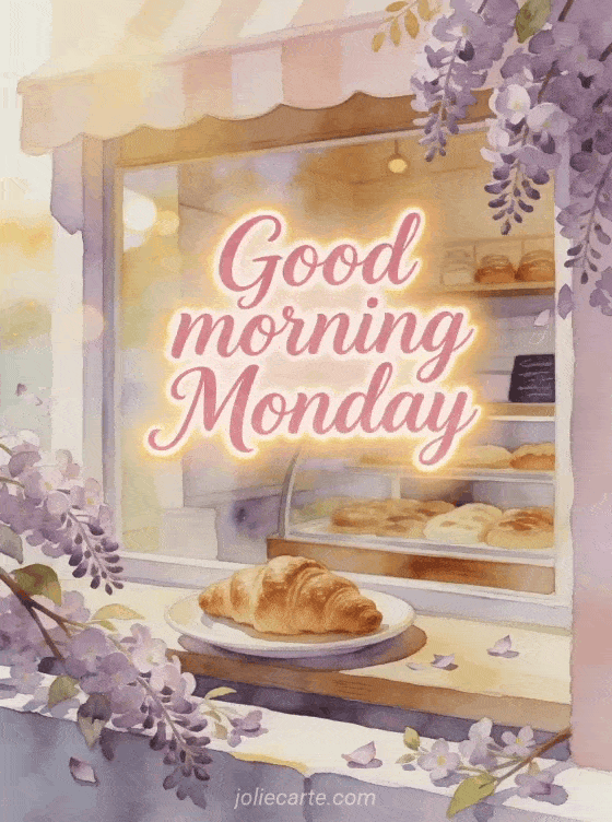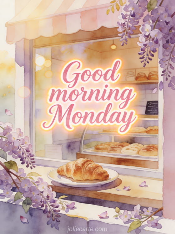 Start Monday gently with a watercolor bakery window, a croissant plate, blooming lilac branches and golden morning light. You can also send happy monday flowers image, share snowy happy Monday image or choose happy Monday good start to the week images.