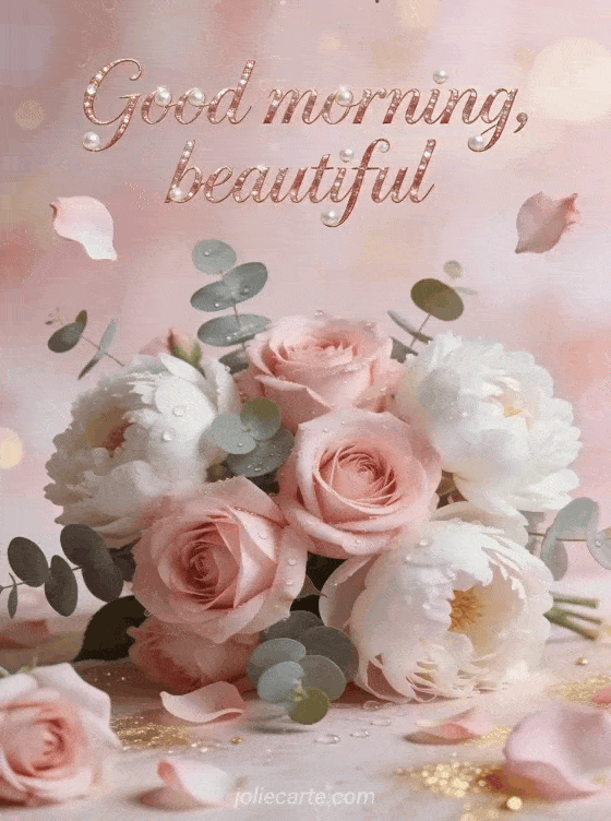 Send a tender good morning beautiful greeting with soft pink roses, white peonies, eucalyptus and glistening morning dew. Discover also a good morning happy wednesday image, happy Wednesday flowers gifs or a good morning good morning happy Wednesday image.