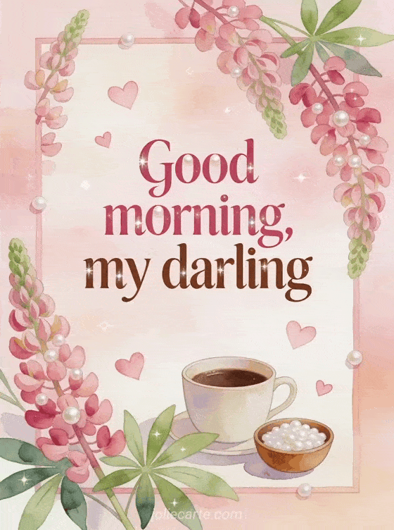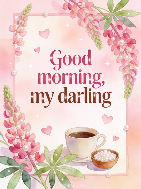 Share a loving morning thought with this watercolor card, featuring a coffee cup, a small bowl of pearl sugar, lupine petals, and delicate heart shapes in soft light. Discover also morning coffee good morning, free good morning coffee image, or coffee good morning coffee animated gif.