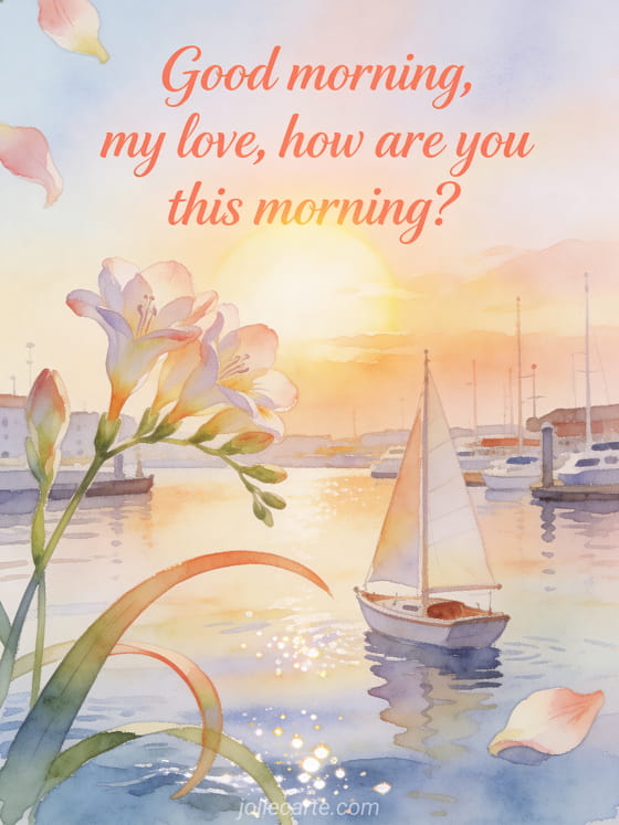 Share a loving morning greeting with this watercolor card, featuring freesia blooms, curved leaves, a small sailboat, and a bright harbor at dawn. Discover also how are you my sweetheart, yes I am fine my darling, or how is my daughter.