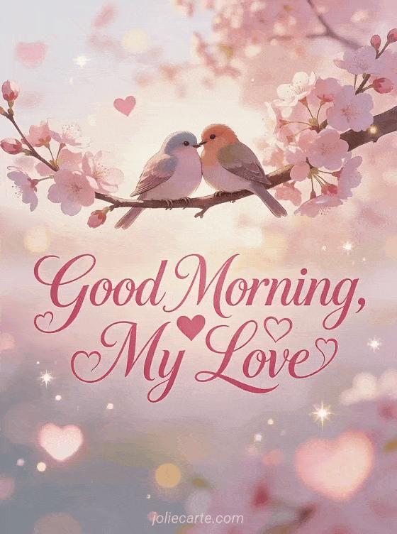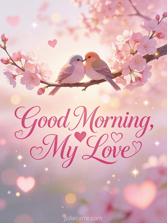 Send a romantic good morning my love with this free card featuring two lovebirds cuddling on cherry blossoms. Discover also a good morning my darling or good morning images.