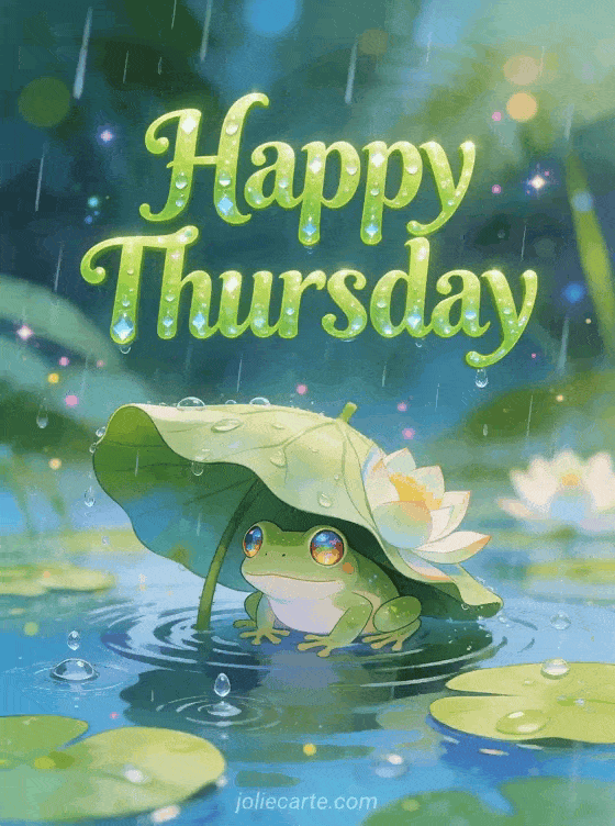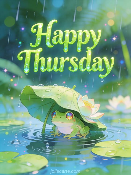 Send this magical good morning rainy Thursday card with a tiny tree frog sheltering under a lotus leaf in the rain. Discover also a happy Thursday big kisses card or a happy rainy Thursday card.