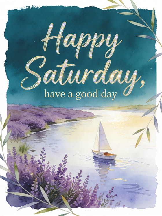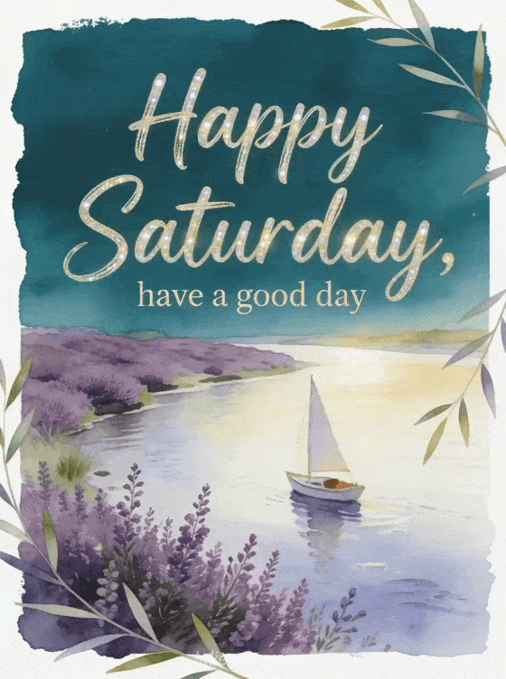 Share a good morning Saturday image with deep teal lettering, a small sailboat near a riverbank and purple heather sprigs crossing the border. You can also send happy Saturday virtual cards, happy saturday lots of kisses gif or happy Saturday and good weekend animated gif.