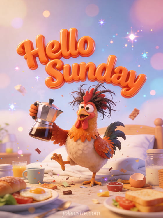 Send a hilarious hello Sunday greeting with a cartoon rooster with crazy bedhead feathers holding a coffee pot. A fun way to start someone's Sunday morning with a laugh. Discover also a tender Sunday card or a Sunday morning card.