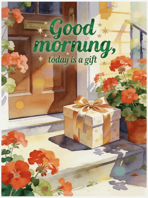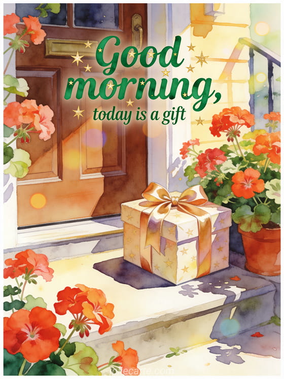 Send a festive good morning card with a wrapped gift box tied with satin ribbon beside bright geraniums on a sunny doorstep. Discover also good morning cards, a simple good morning message or a good morning darling message.