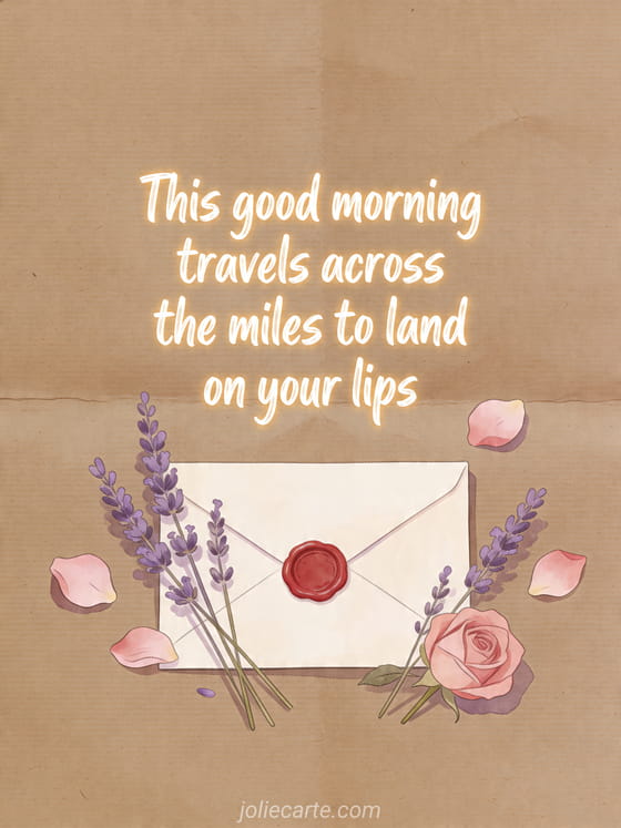 Share a tender long-distance message with this free good morning card featuring a sealed letter, dried lavender and rose petals on kraft paper. Discover also good morning my love long distance, quote missing you love distance or love message distance.