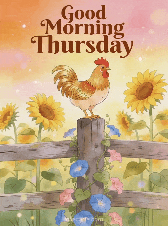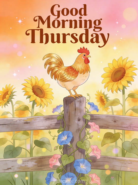 Share a lively Thursday morning wake-up with this charming rooster farm greeting. Discover also a happy Thursday card or a it's Thursday have a good day card.
