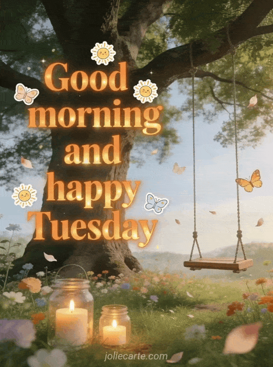 Wish a beautiful Tuesday with orange glowing text, little suns, joyful butterflies, a wooden swing under a great oak, and candles in glass jars across a flower meadow. Discover also a free happy Tuesday kisses image, a zen tenderness positive quote happy Tuesday, or a have a happy Tuesday.