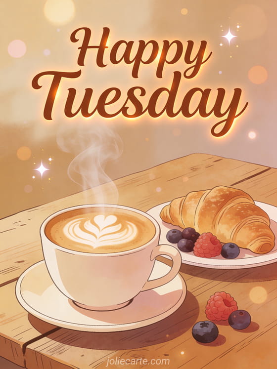 Send this cosy good morning Tuesday coffee card to wish a wonderful start to the day. Discover also a beautiful happy Tuesday image card or a funny happy Tuesday card.