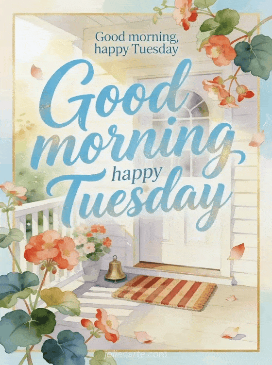Send a welcoming good morning and happy Tuesday with a bright porch, begonia flowers, a striped doormat and a small brass bell. Discover also happy Tuesday my friend image, happy Tuesday animated picture or animated happy Tuesday kisses images.
