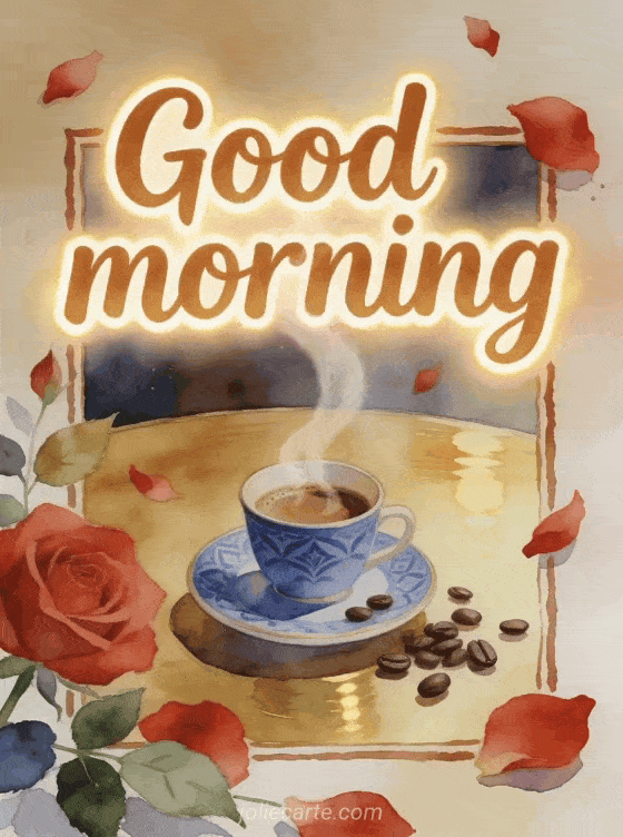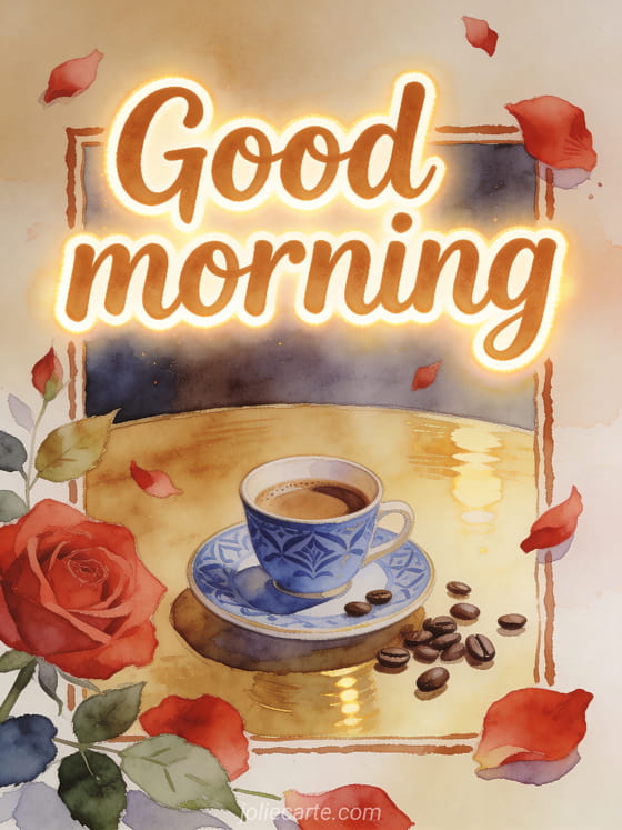 Send a warm good morning with a coffee card featuring rounded caramel lettering, red rose petals, an espresso cup on a blue patterned saucer and scattered coffee beans. You can also share good morning coffee photos, a gif good morning coffee croissant or good morning coffee tenderness.
