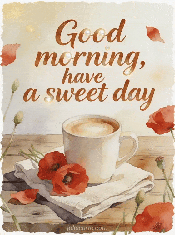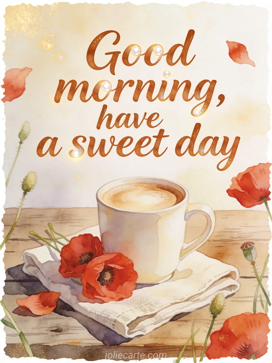 Share a sweet good morning with a creamy cappuccino mug, red corn poppies, a folded linen napkin and a rustic wooden table. Discover also good morning good coffee gif, good morning sweetheart coffee or good morning coffee coffee.