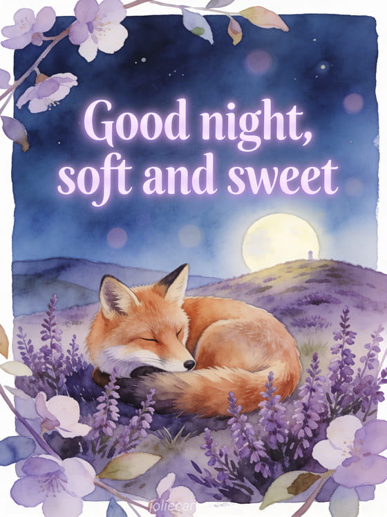 Share a tender good night message with a curled fox near a moonlit heather hill, purple blossoms, and soft blue night light in watercolor. Discover also an animated good night card, a message to wish goodnight, or a good evening and good night message.