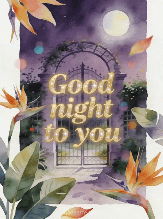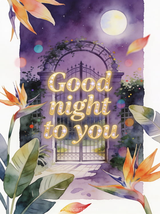 Send a peaceful good night wish with an arched garden gate, a violet sky, moon glow and bird of paradise flowers. Discover also a good evening good night virtual card, a lovely good night message or a good night message for him.