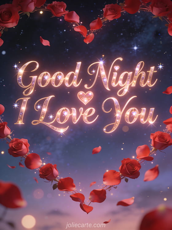 Send a passionate good night I love you card to your partner with this beautiful free card. Rose petals forming a heart shape under a starry night sky, perfect to express your deepest feelings. Discover also a good night my one and only love card or a good night I love you my love gif.