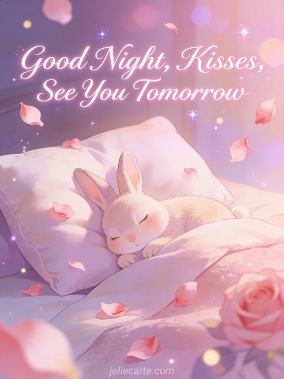 Wish someone a romantic good night with this tender card featuring a sweet sleeping bunny among soft pillows with delicate rose petals floating gently. Discover also a good night kisses see you tomorrow gif card, a funny good night see you tomorrow card or a gif good night see you tomorrow card.