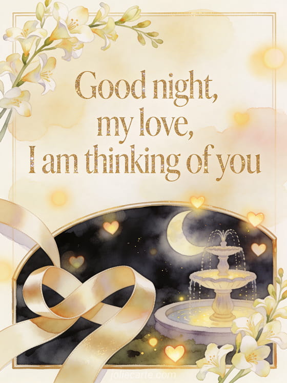Share a romantic good night card with interlaced satin ribbons beside a moonlit fountain, floating heart lights and freesia sprays. Discover also a beautiful message to wish good night, a message to wish his wife good night or a message to wish his girlfriend good night.