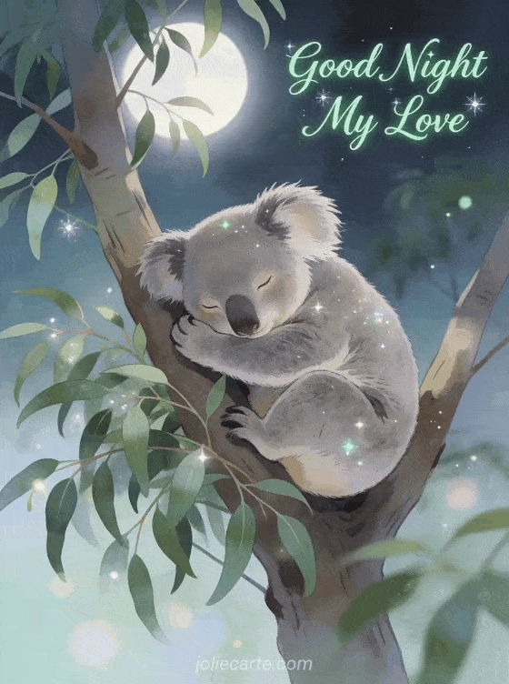 Wish sweet dreams to your loved one with this peaceful Good Night My Love card featuring a cute koala sleeping in a eucalyptus tree under the moonlight. Discover also a good night my love image or a good night sweetheart card.