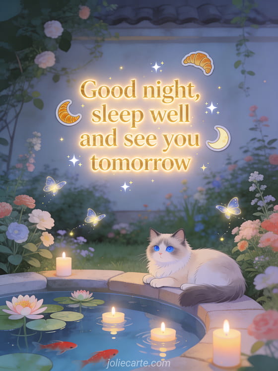 Good night message a peaceful good night card with a ragdoll cat by a garden pond