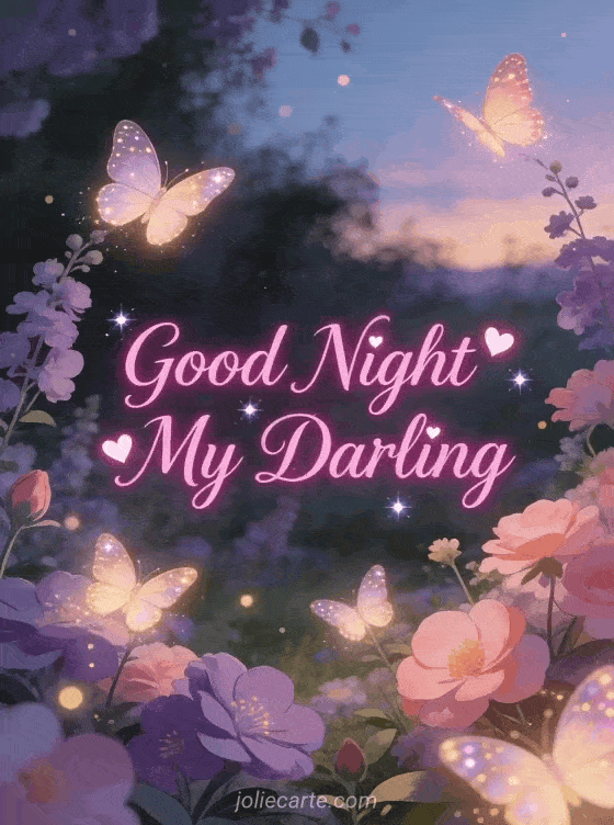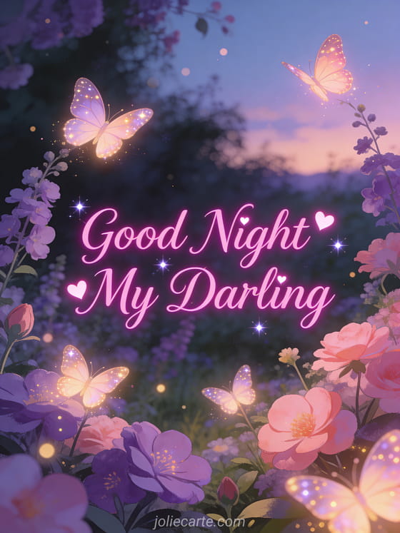 Send a magical good night my darling love message with this beautiful free card. A beautiful butterfly garden at dusk with purple and pink flowers and glowing butterflies, for a fairy-tale romantic goodnight. Discover also a wishing your love good night card or a good night love message image card.