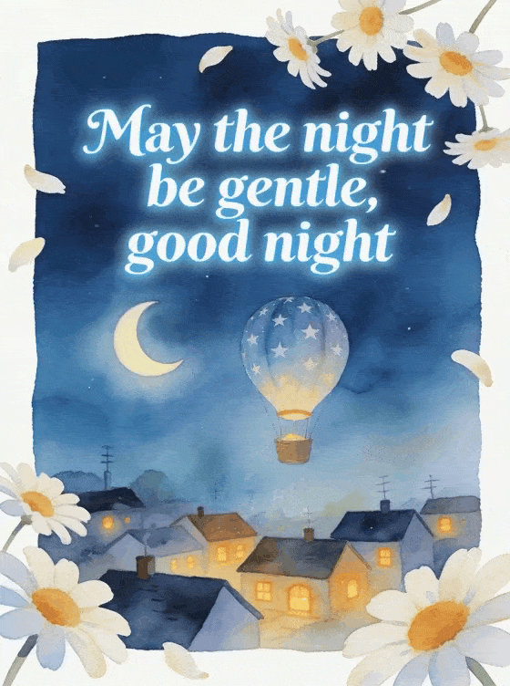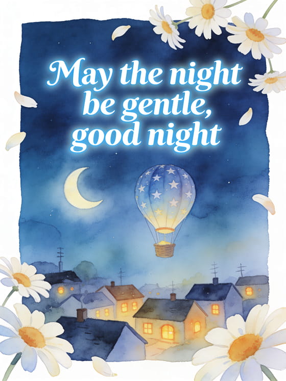 Send a soft good night greeting with a small star-patterned hot air balloon above a sleeping village, a crescent moon and drifting daisy petals. Discover also a cute good night message, good evening and good night cards or good night wishes.