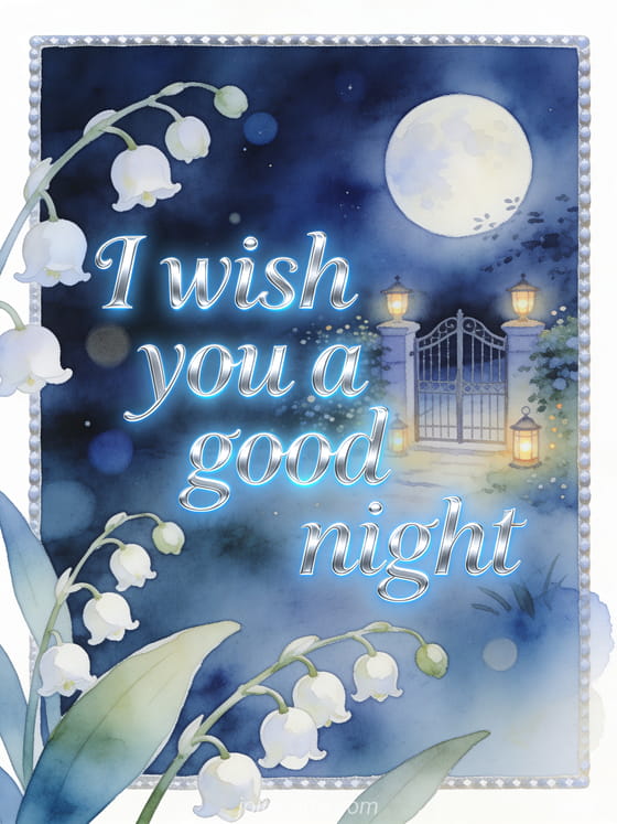 Wish someone a good night with a soft watercolor garden gate under a round moon, tiny lantern lights, and lily of the valley flowers in the foreground. You can also send a good night card, a darling good night message, or a pretty message to say good night.
