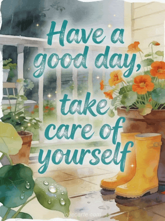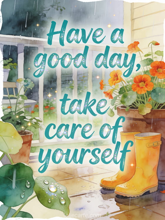 Share a soft rainy day greeting with teal lettering, sparkling raindrops and a bright garden mood. This free card is made to send a caring message and remind someone to take care of themselves. Discover also a good rainy day card, a kisses gif nice day kisses I love you card or a kisses beautiful day gif card.