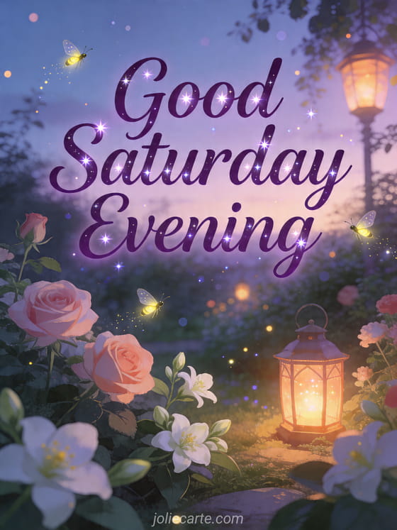 Share this enchanting good Saturday evening card with dancing fireflies, glowing lanterns, roses, and jasmine in a magical garden. You can also discover happy saturday gif, happy sunny saturday and happy saturday images.