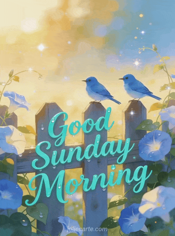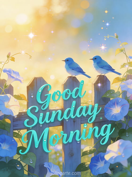 Send a fresh good Sunday morning greeting with bluebirds singing on a fence with morning glory flowers at cheerful dawn. A lovely way to start someone's Sunday. Discover also a happy Sunday card or a good day Sunday card.