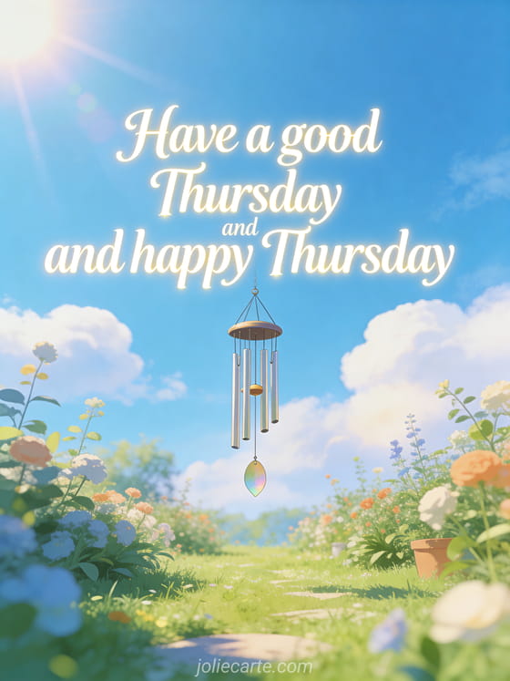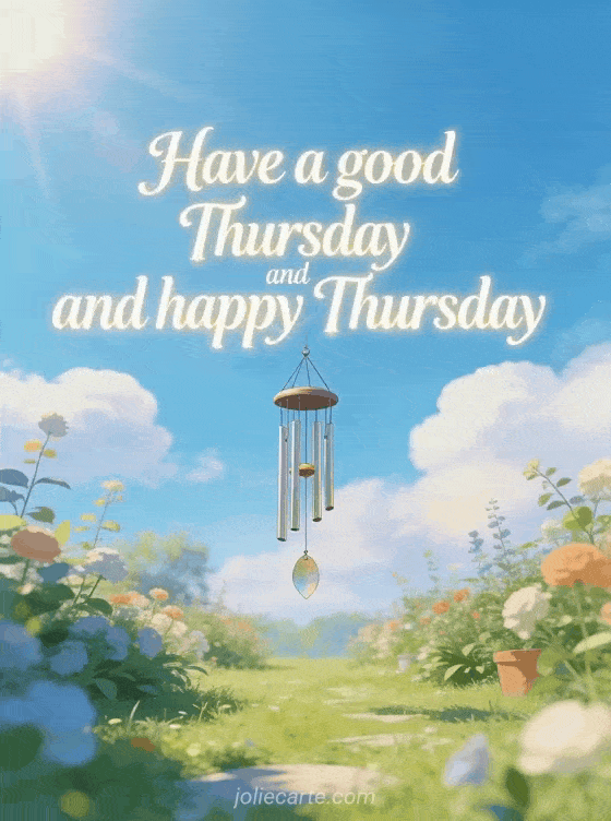 Share a fresh good Thursday day greeting with elegant glowing script and a sunny garden wind chime. You can also send a happy thursday kisses animated gifs, a happy thursday pretty card or a happy thursday gif to brighten the day.