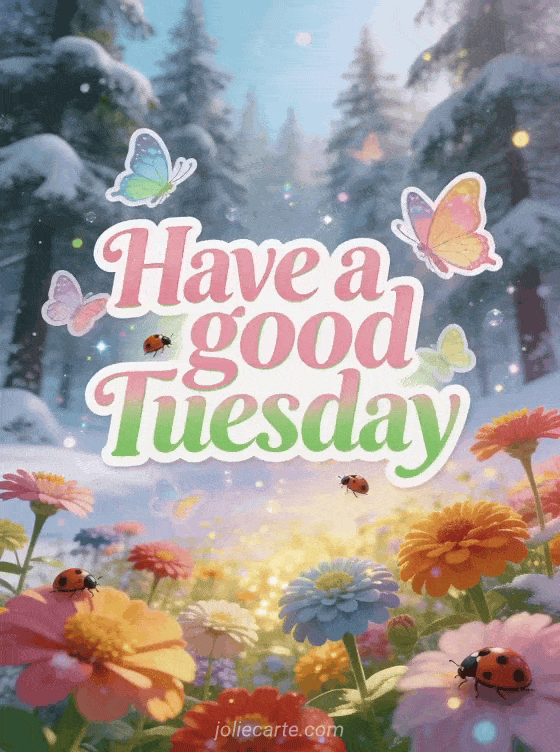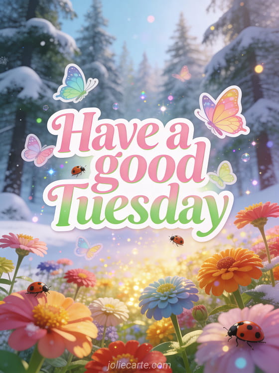 Send a colorful good Tuesday card with pink spring letters, green touches, butterflies and ladybugs, where bright zinnias bloom in front of a snowy fir forest in a magical transition from winter to spring. Discover also free happy Tuesday kisses images, happy Tuesday kisses image or happy tuesday humor image.