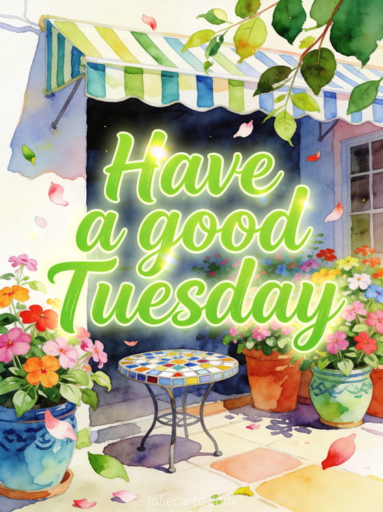 Wish someone a good Tuesday with a fresh watercolor courtyard scene filled with impatiens in glazed pots, a small mosaic table, and a striped awning. You can also share good morning happy Tuesday images, a happy tuesday animated gif animated gif, or a happy Tuesday evening image.