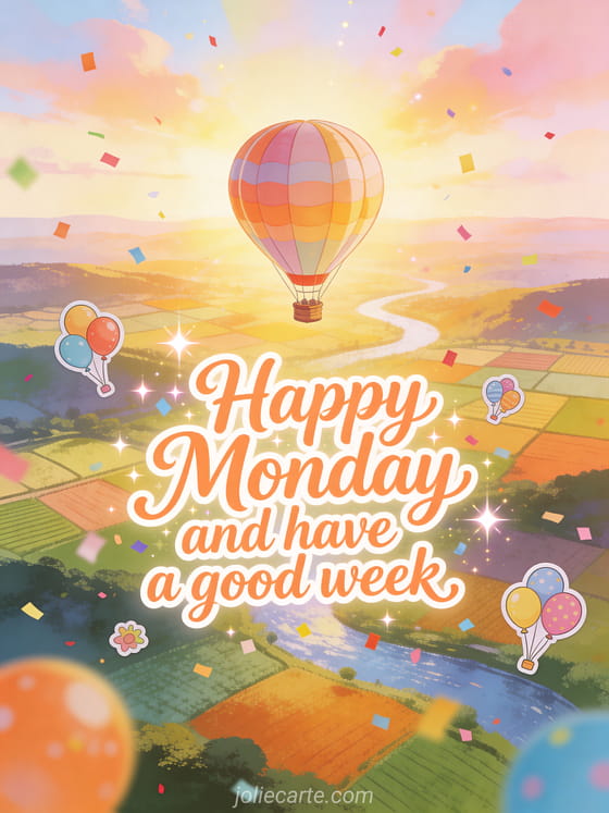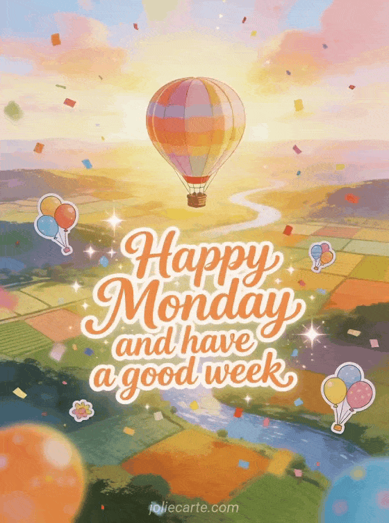 Send happy Monday and a good week with a hot air balloon drifting above a sunlit valley, patchwork fields and a winding river. Discover also happy Monday card, happy monday virtual cards or happy monday humor animated gif.