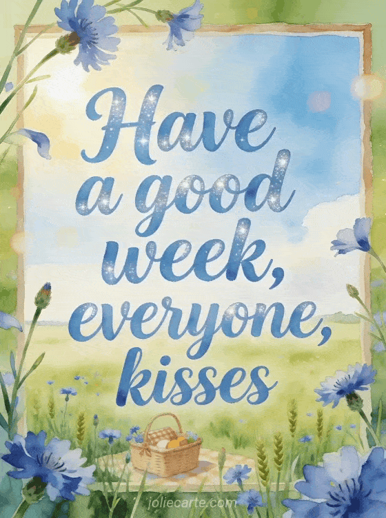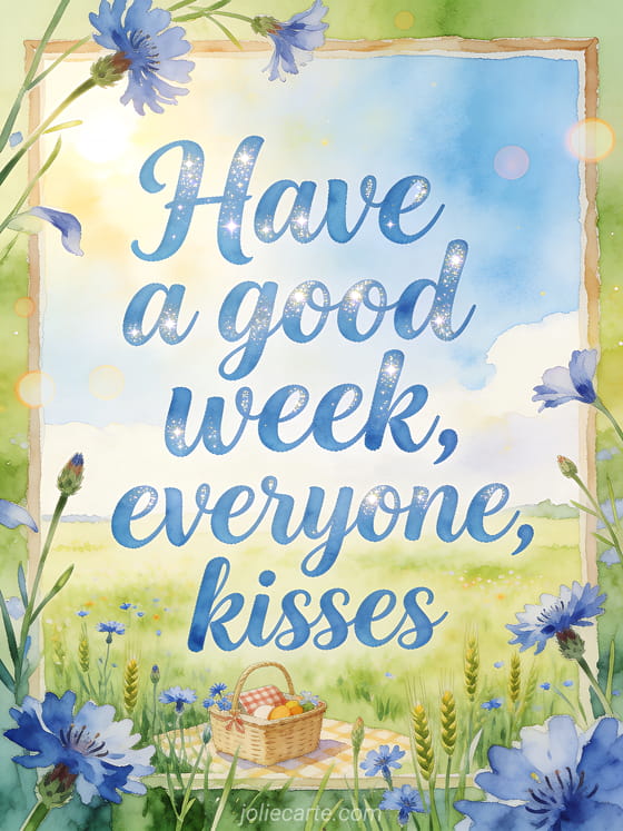 Send a warm good week greeting to everyone with a picnic basket tucked among cornflowers, a green meadow and bright open sky. Discover also a good week kisses animated gifs, a beautiful week kisses or a have a nice winter week with hot coffee.