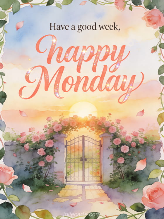 Send an encouraging good week and happy Monday greeting with sunrise over a small garden gate covered in pink roses, petals and leafy stems. Discover also good morning Monday good morning image, an animated happy monday image or a happy Monday encouragement image.