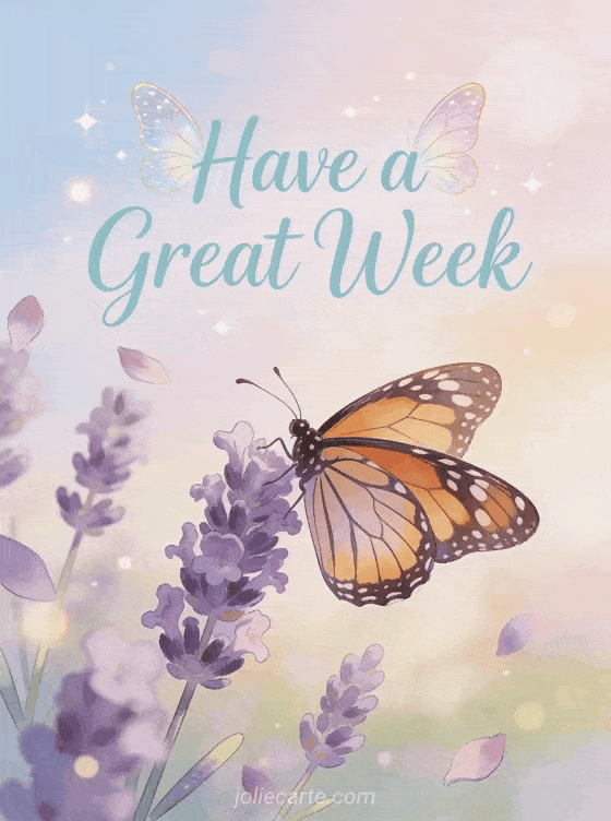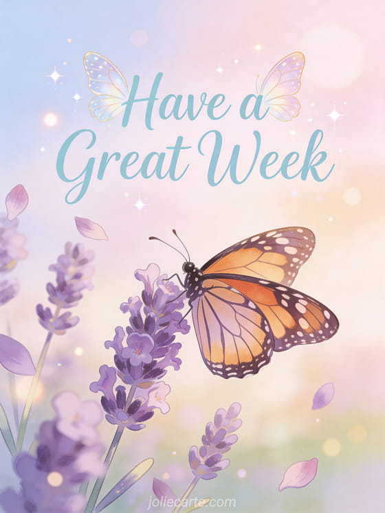 Send a beautiful good week image and bring some nature serenity to someone's day. A monarch butterfly resting on lavender blooms creates a peaceful and fragrant atmosphere. Discover also a funny good week animated gif or a beautiful day and good week card.