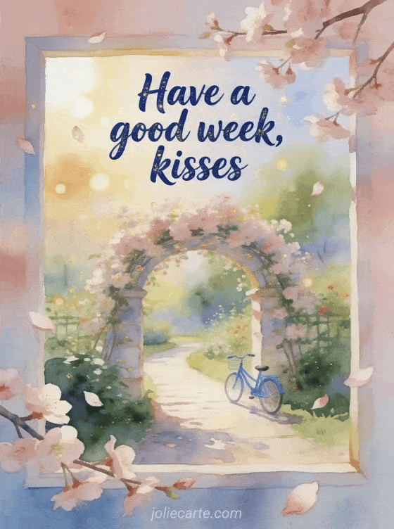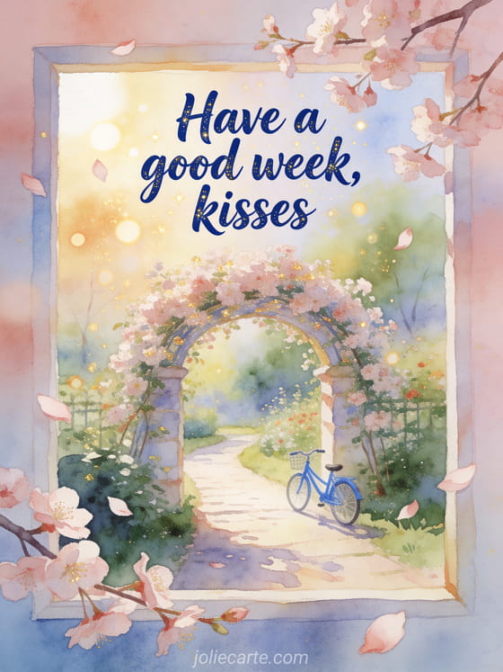 Share a bright start to the week with a watercolor garden path, cherry blossoms, soft petals and a small blue bicycle. You can also send have a nice week everyone, funny have a nice week or good morning everyone and good week.