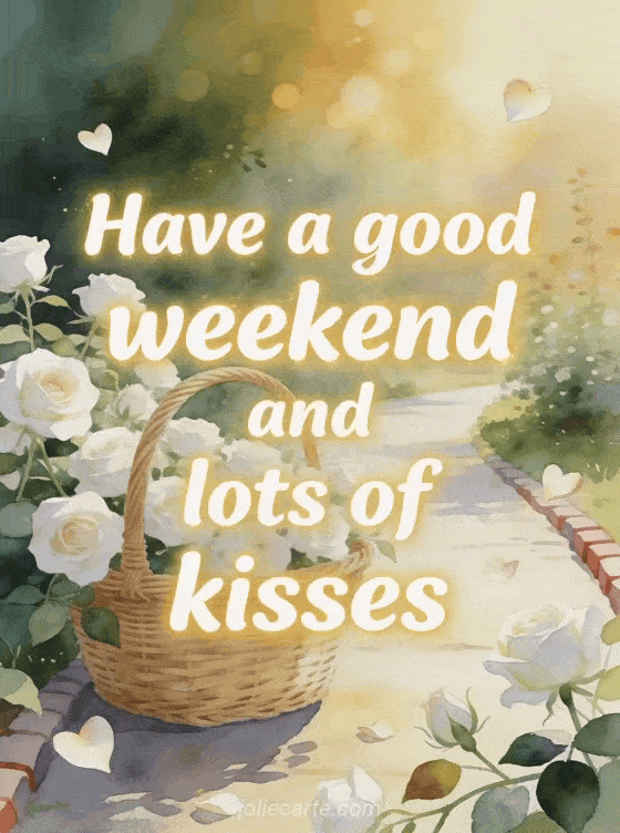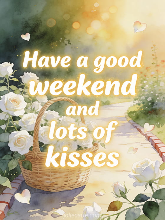 Send an affectionate good weekend greeting with white roses blooming around a wicker basket on a sunlit garden path and heart-shaped petals. Discover also a great weekend kisses gif, a humor have a nice weekend photo or a kisses great weekend.