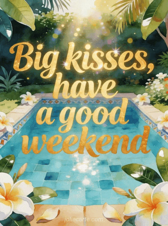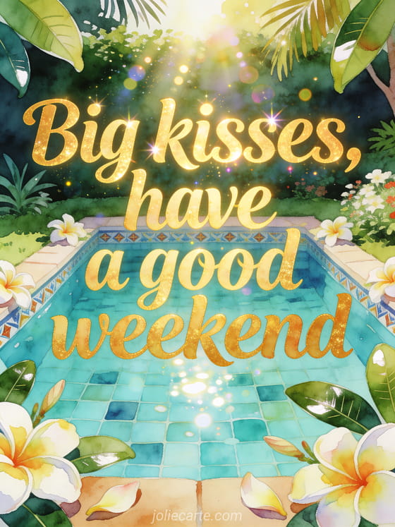 Send a joyful weekend card with vibrant watercolor lettering, frangipani blossoms, a turquoise garden pool, patterned tiles and bright tropical sunlight. Discover also a great weekend butterfly kisses, a wonderful weekend kisses gif or a happy weekend kisses gif.