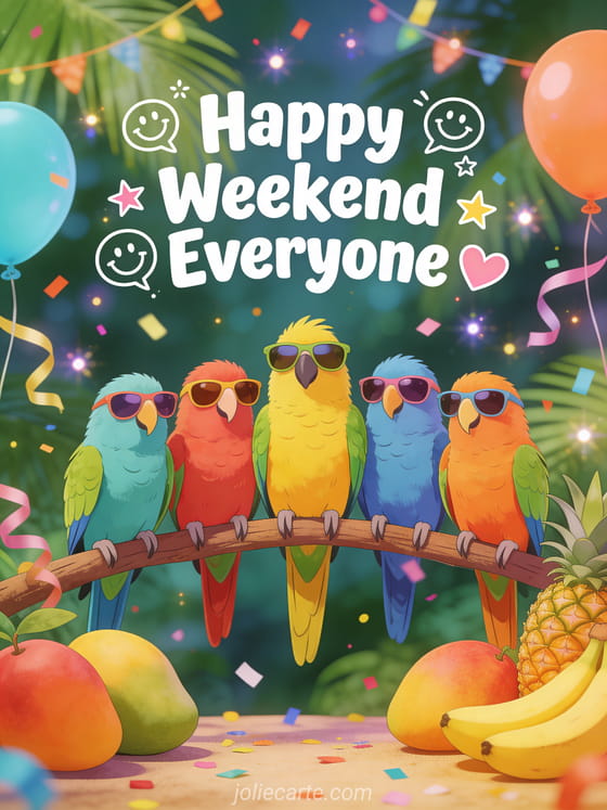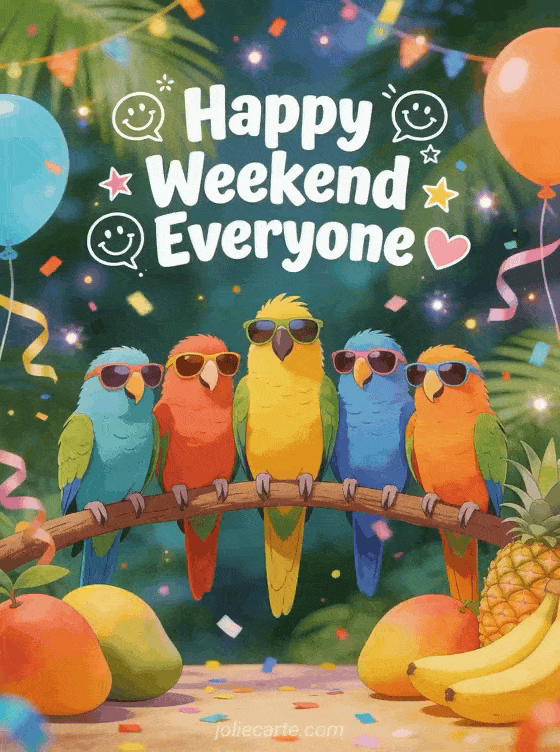 Good weekend everyone humor a funny and colorful weekend greeting for everyone with tropical partying parrots