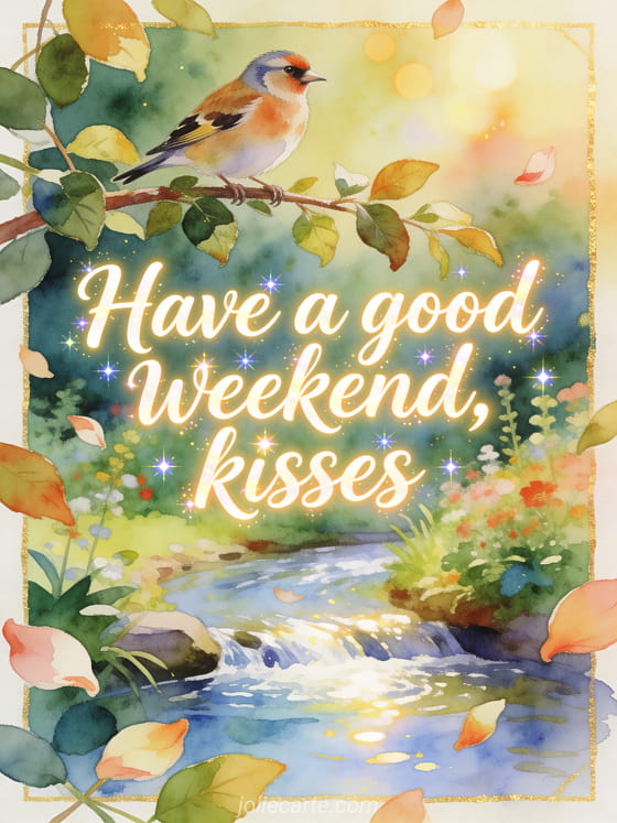 Share a lighthearted weekend greeting with soft watercolor lettering, golden garden light and affectionate kisses. Discover also a great weekend kisses images, a happy weekend kisses pictures or a happy weekend big kisses image.